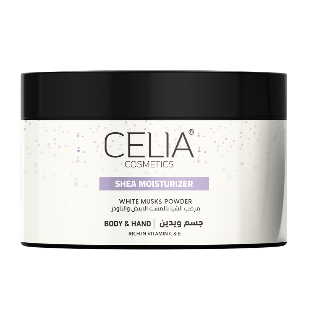 مرطب الشيا بالعكر الفاسي للجسم واليدين من سيليا رطوبة ونعومة فائقةمرطب مغذي ومريح للجسم واليدين يحتوي على زبدة الشيا التي تعمل على ترطيب البشرة بعمق وتغذيتها.يحتوي على المسك الأبيض والبودرة التي تضفي رائحة مميزة ومنعشة تدوم طوال اليوم. تعمل تركيبته المرطبة والمغذية على شد البشرة وتحسين نعومتها ومرونتها.يعمل على تغذية البشرة وحمايتها من العوامل الخارجية لاحتوائه على الأحماض الدهنية و فيتامين E.يساهم في تحسين لون البشرة.يفتح ولوحد لون البشرة.يعمل على ترطيب البشرة بعمق.يجعل البشرة ناعمة وحيوية.يحسن ملمس البشرة.يحمي البشرة من الجفاف والتشققات.يمنح البشرة نعومة ونضارة.يساعد في إضفاء رائحة مميزة ومنعشة.لا يترك أي أثر دهني على البشرة بعد الاستخدام.
