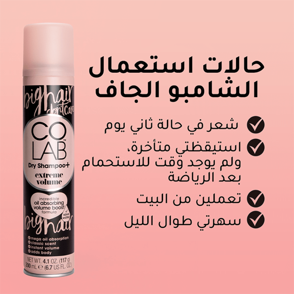شامبو جاف اكستريم فوليوم من كولاب للنساء:يستخدم الشامبو الجاف لتنظيف الشعر بديلاً للشامبو العادي.يمتص الزيوت من الشعر ويجعله منتعش ينبض بالحيوية.يمنحك شامبو كولاب شعر صحي وجذاب.فعال في المواقف الطارئة والسريعة.امنحي شعرك الحيوية والنظافة مع هذا الشامبو.